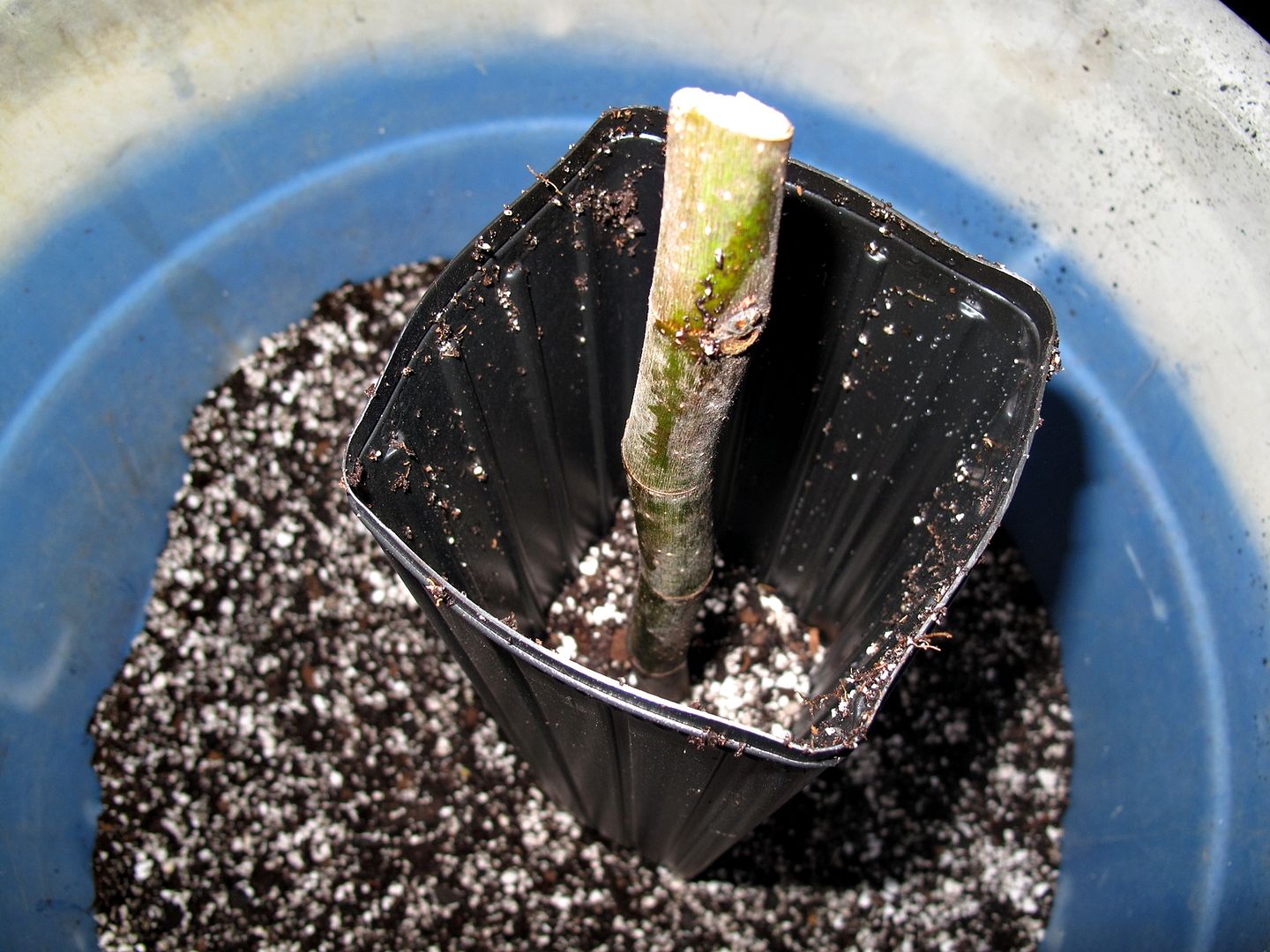 I added a soil mix consisting of mostly perlite and some pine bark and peat moss. Cover most of the cutting and expose only one bud.
