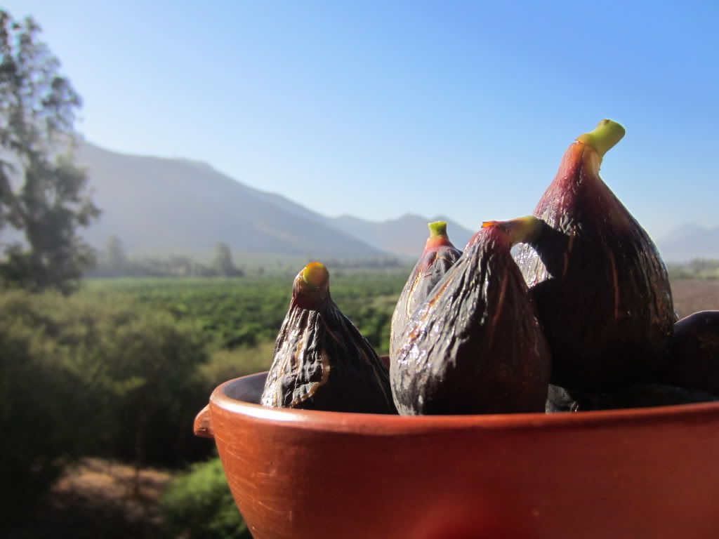 Bowl of breakfast figs overlooking porch onto orange groves at B&B