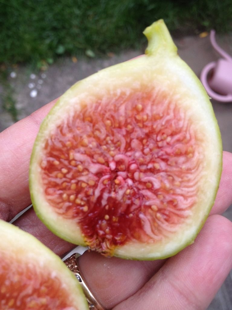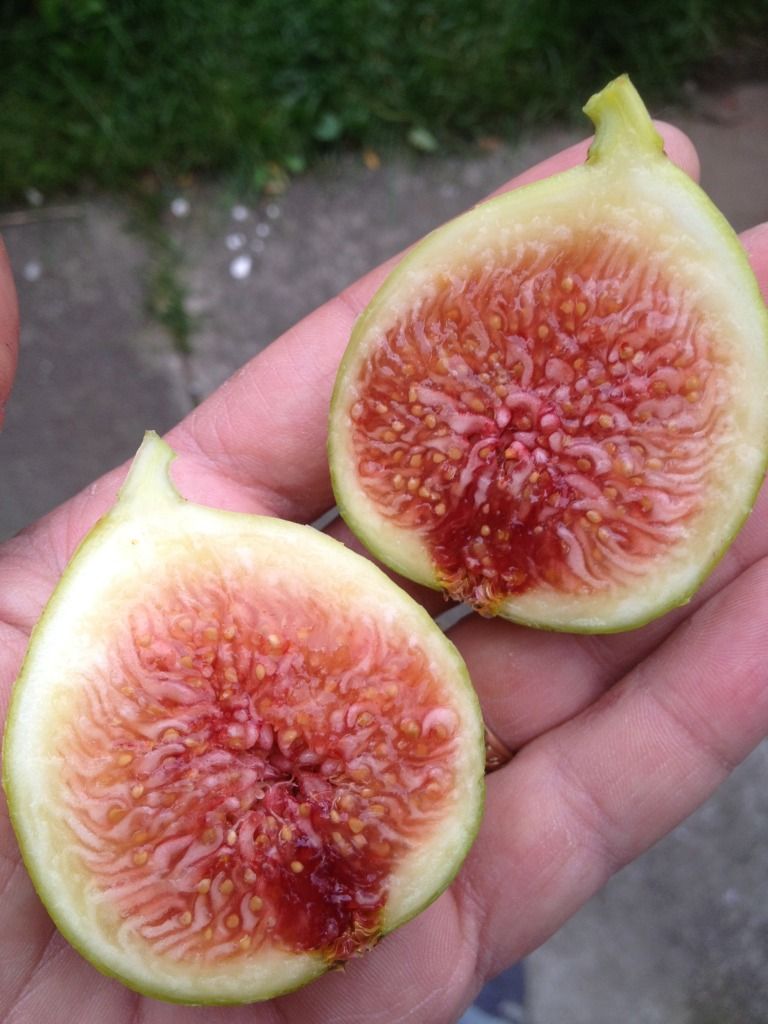 Hope you don't mind me adding photos of my first Conadria to your posting thread. (It just seemed better than starting a totally new thread on the same fig). This was my first Conadria (got just two this year, the first year that this second-year tree has fruited). It was very slow to finish ripening... took two or three weeks in the "bulging" final stage, during which time there was a week of heavy rain and also a week of beautiful warm fall weather. But overall the taste of this one was a bit watery, even resembled "cucumber" taste (if there is such a thing in figs). I liked it anyway, and will hold onto the tree to see if the taste improves in future years. Not horrible but not nearly as good as the delicious fig that you described. Hoping that next year it's as good as the ones that you and your father got!