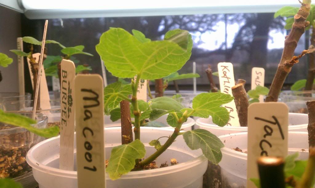 All of my cuttings (that have enough roots) are wicked, that is the cup under the cutting you see in the picture. On the light shelf there is a common reservoir under them. So far it has worked pretty well. I always use wicks so figured why not for the figs. There are a few advantages...the cuttings stay evenly moist, there is increased humidity around the plants, the perlite does not float up like with top watering, it avoids over watering. Because of the increased perlite content I have had a couple cups stop wicking. I have started using two wicks per pot and taking the wick all the way to near the surface of the pot. Just something different some may want to try. It is nice to be able to walk away from the cuttings for a week and now they are being automatically watered. So far have had no rot issues using the wicks. I do not use wicks in the cups until the cups have quite a bit of roots.