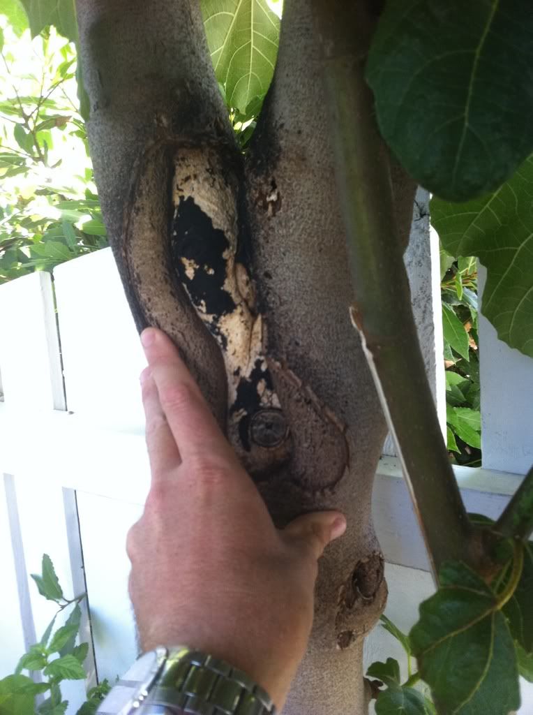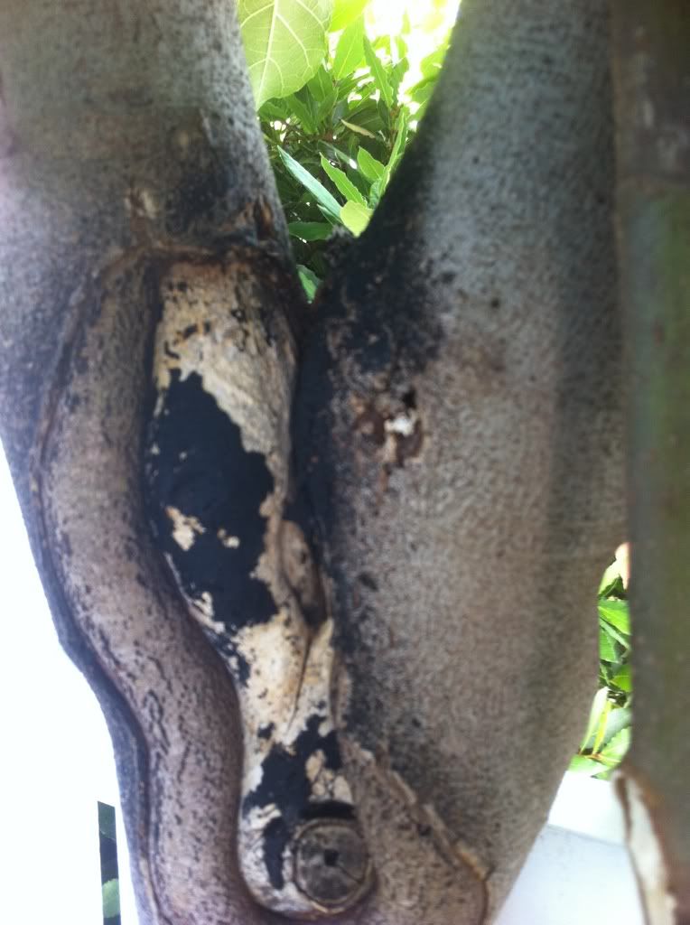 You might put a screw eye deep into each of the two branches, 2 or 3 or 4 feet above the split, and then put a turn buckle between the two screw eyes and slowly tighten them together, and just leave it there. This would provide a permanent source of additional strength.