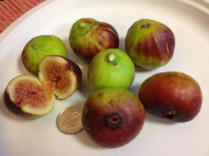 Note all those pics only show two different figs - if you look at the smaller list of pictures at the bottom of my post, the first four are one fig, and the last three are another. They are about 4 days apart in ripeness, so, you see, 3-5 days means the difference between a fluid-filled reddish-purple fig and a halfway-hollow fig that's green on the top half with red stripes to the bottom.