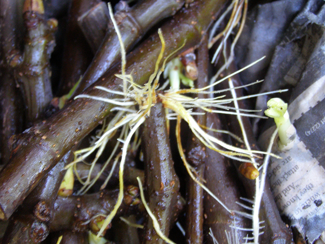 I didn't control temp or moisture, other than some initial damp paper on the top of the pile, and tying the bag shut (it does have some holes). The cuttings closer to the top and the moist paper rooted the most. The more interesting thing is than almost every cutting showing roots, and esp. the ones with good root development were upside down. I mentioned this last year, but this year seems to reinforce that observation. It may be advantageous to store the cuttings vertically in the frig and upside down.