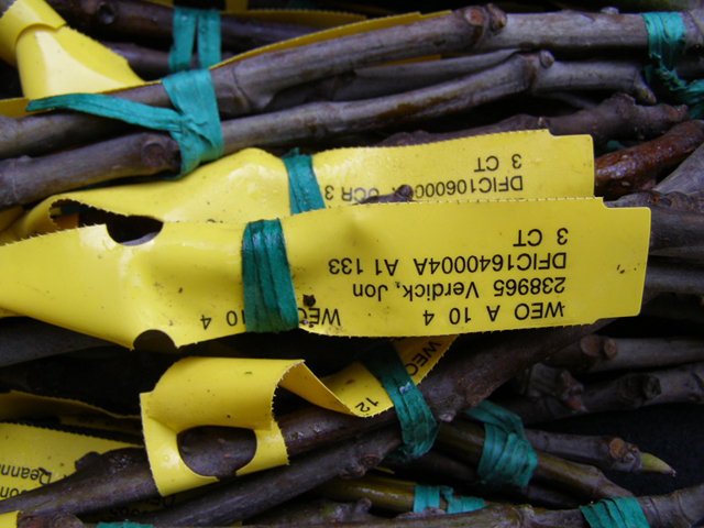 A1 133 is the "name" for these 10 seedlings, which are known as DFIC0164-1 through -10. Number 2 has apparently been lost. DFIC stands for Davis and Ficus. (Prunus cuttings would be DPRU, etc.) 164 is the Accession Number. These cuttings came from WEO (Wolfskill Experimental Orchard) and is orchard tree position A-10-4. A lot of info packed onto that little tag.