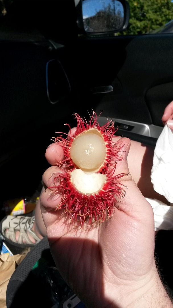 Rambutans were a dangerous looking fruit that was actually sweet inside. They are very much like longons, but without as rich a flavor (more sweet) and the flesh doesn't peel off the pit as easily.