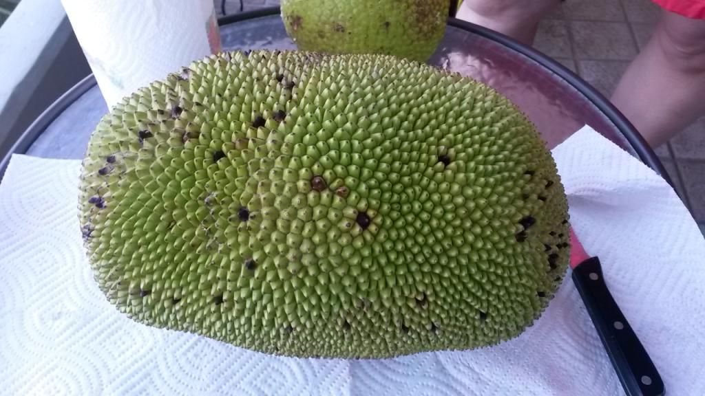 We got a bread fruit at the farmer's market as well. We ran out of time and it didn't ripen enough to eat raw. We were told at this stage people either slice it and cook it like a pancake or chop it and treat it light a potato. I did taste some and I could see that fried it would probably be delicious!