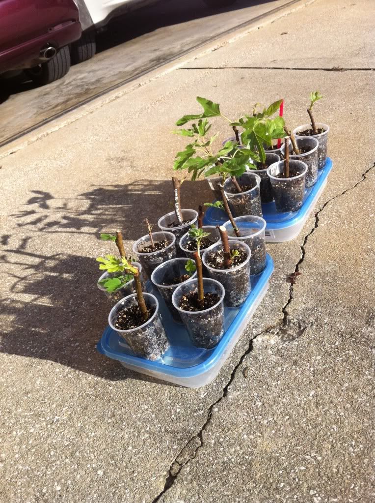 Sorry, I meant to write about figs as well... I think a slightly modified version of this system would be of great benefit to those rooting in cooler climates. Basically, if the container is slightly taller than the cups being used to root in, and the holes cut allow for the cup to slide almost all the way into the container, this becomes a greenhouse for the roots. My greatest success in rooting came when I rooted during the winter months in Houston. We didn't have any freezes during the period, but the weather was cool most of the time. I set my containers in full sun so the root zone was heated. The parts of the cutting above the growing mix was exposed to the cool weather and was slow to leaf out giving the roots more opportunity to grow. ~james