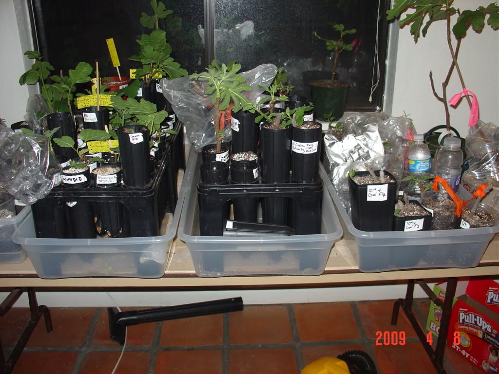 1) Floor temps, Many things are rooted by using bottom heat. Doesn't seem necessary for figs. However, after you pot them up, if you place them in a colder environment and/or on a cold floor, you have supplied bottom cold and not bottom heat. I figured out that even in my greenhouse, the floor and/or lower levels were considerably colder than the upper shelves, and had to isolate newly potted cuttings from the floor, and install a fan to better circulate the air to the lower portions. Cost me $10 at Walmart for a 3" fan. This has made a huge improvement. If you need to isolate your pots from a cold floor, a quick way is to put the pot inside a same-size pot, or maybe even 2-3 pots, which adds a 1/2" of airspace under the pot, for each pot you use. Admit, you have extra pots, so this is a free fix.