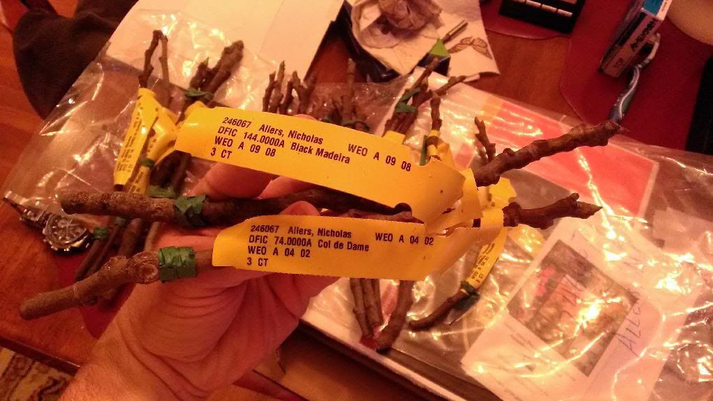 Thanks Pete.  I had actually placed two orders last year, one real early with most of what you see, the second order with Black Madeira, Col de Dame, Black Ischia, Pastillere and a few others.  Both orders came together yesterday.  I took the top 3" off of both the CdD and BM and put them in a 2L humidity dome to try out that method of rooting.  The remainders of the two cuttings were split in half, dipped in rooting hormone, waxed on the top end and placed in moss like normal.  Having the extra cuttings of less rare varieties is going to make for a fun summer of experimenting on grafting, rooting methods, etc.